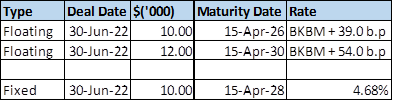 4.6 In tandem with this analysis, officers forecasted cash flows needed in light of the large capital spend underway in Council. In consultation with Bancorp treasury advisors, Council borrowed $32m, with a mix of fixed and floating and over different maturities. This is itemised in the table below: