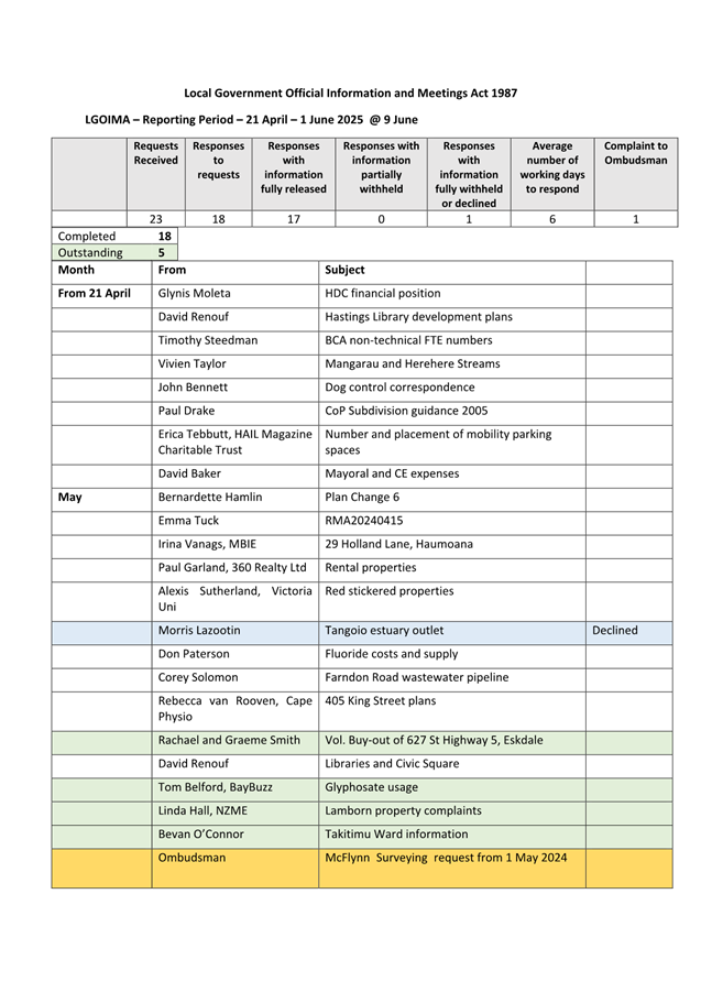 1.1 The purpose of this Report is to inform Council of the number of requests under the Local Government Official Information and Meetings Act 1987 (LGOIMA) received from 21 April 2025 to 1 June 2025 and the status of those requests as at 9 June 2025.