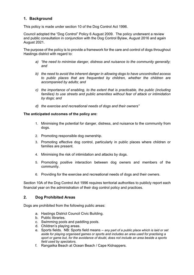1.2 Council is required under Section 10A of the Dog Control Act 1996 (The Act), each financial year to report on the administration of its Dog Control Policy adopted under Section 10 of the Act and its dog control practices.