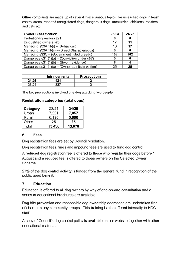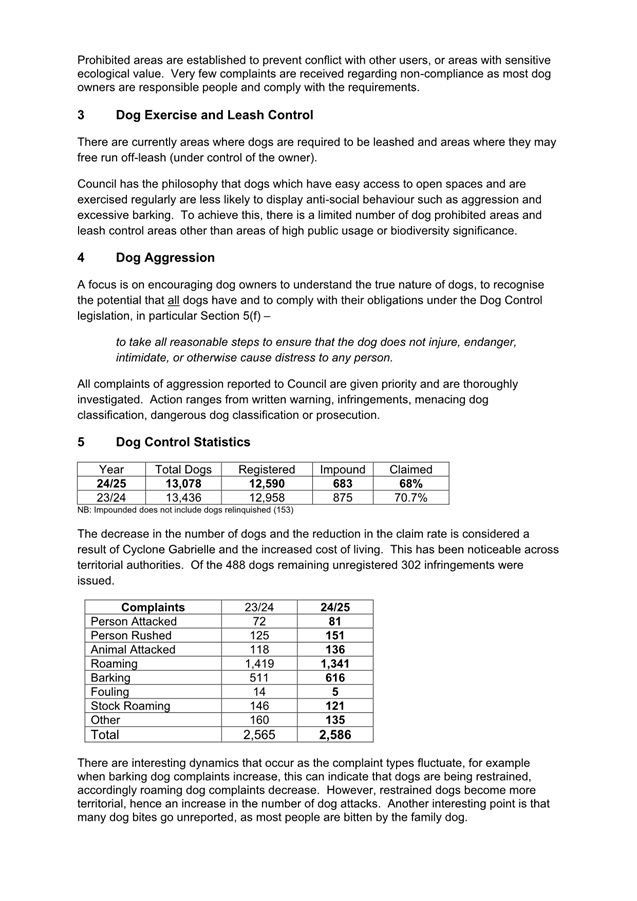 4.5 Complaint numbers have remained reasonably static however, the total number of dogs and the number of registered dogs has decreased for the second year running. The reduction in dog numbers is considered a result of the effects of Cyclone Gabrielle and the increased cost of living. Other areas around New Zealand have reported similar decreases. The team is currently focusing on registration compliance with respect to the 2025/2026 registration year.